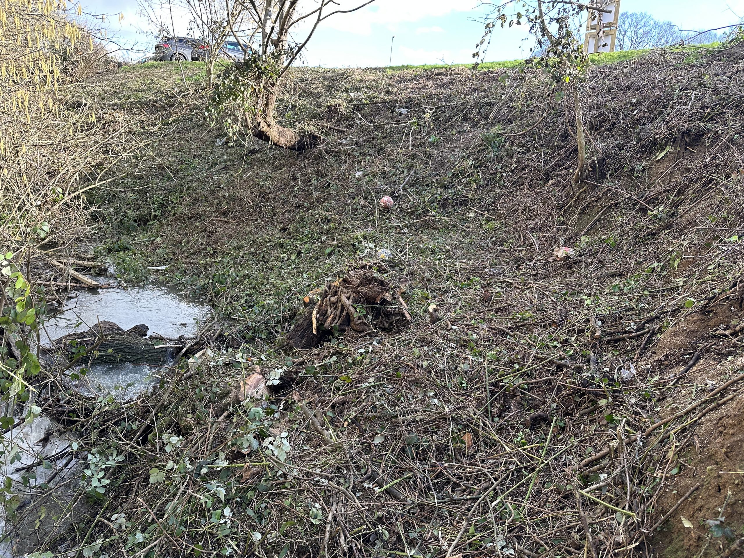 Clearing the bank down to the River Chelt at Dunkertons — transforming overgrown waterway margins into a beautiful, accessible riverside destination.